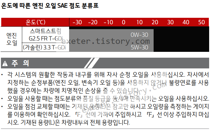 *2. 만약, 위의 추천 오일을 사용 할 수 없는 경우, API 최신 (or ILSAC 최신) 혹은 ACEA A5/B5등급의 합성유를 사용할 수 있다. 만약, 광유 또는 세미-합성유를 사용할 경우, 엔진 오일 교체 주기의 경우 가혹 조건을 따른다.