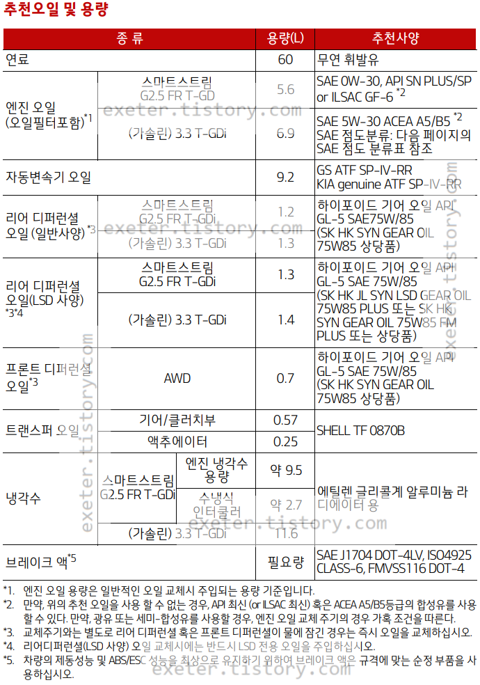 - 엔진 오일 (3.3 T-GDi): 6.9 리터 (SAE 5W-30 ACEA A5/B5 *2)