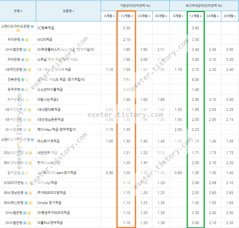 아래는 시중은행 적금 상품의 정기적금 금리를 정액적립식/단리/12개월 기준, 높은 순서로 정렬한 자료입니다.