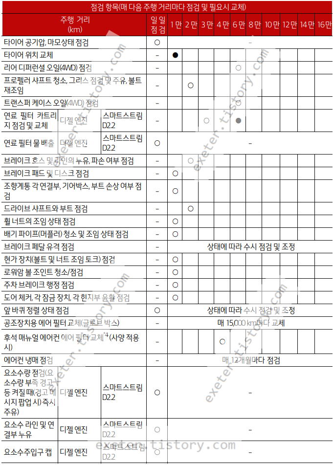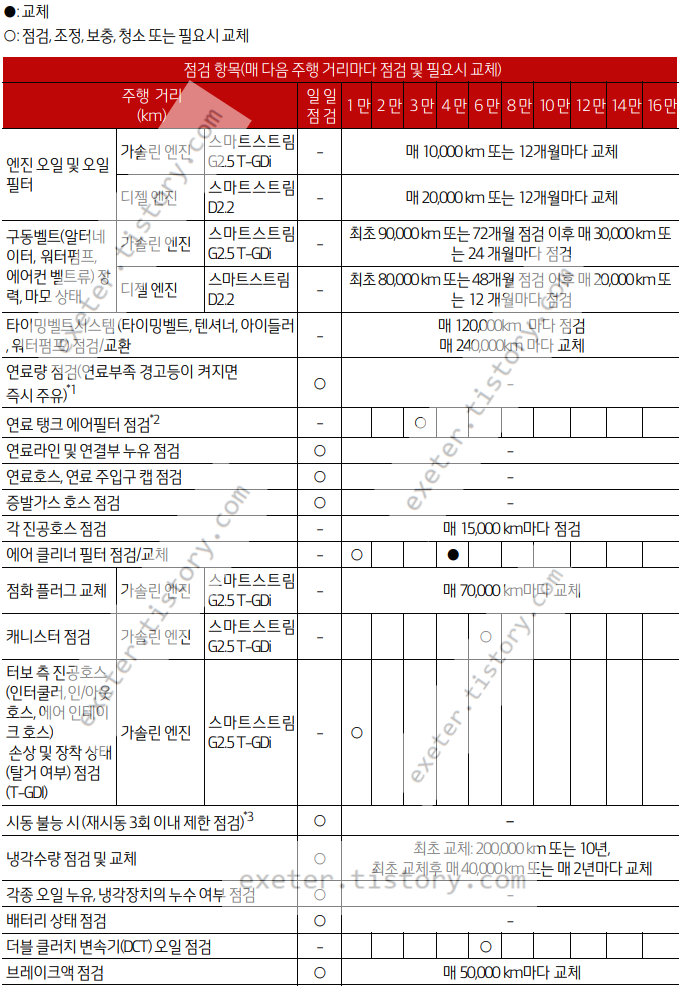 - 연료 필터 카트리 지 점검 및 교체 (디젤 엔진): 3만 km 점검 및 6만 km 교체