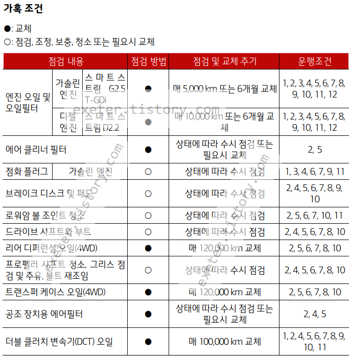 차량 사용 설명서에서는 '가혹 조건'인 경우 교환/점검 주기를 빠르게 가져가도록 안내하고 있습니다.