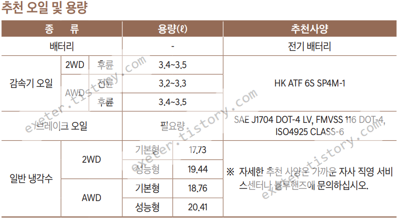 - 감속기 오일(AWD 후륜): 3.4~3.5 리터 (상동)
