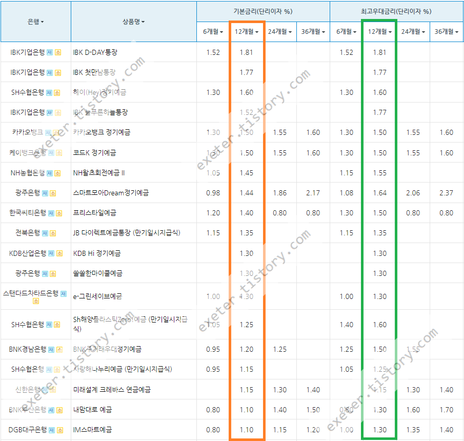 은행 / 상품명 / 기본금리 (단리 이자(%), 12개월 기준)