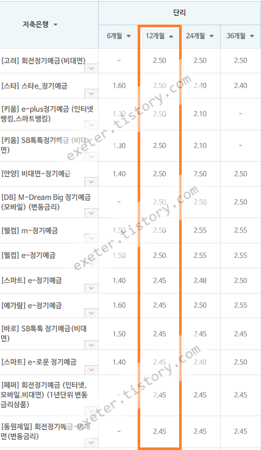 은행 상품명 / 기본금리 (단리 이자(%), 12개월, 높은 이자순서)
