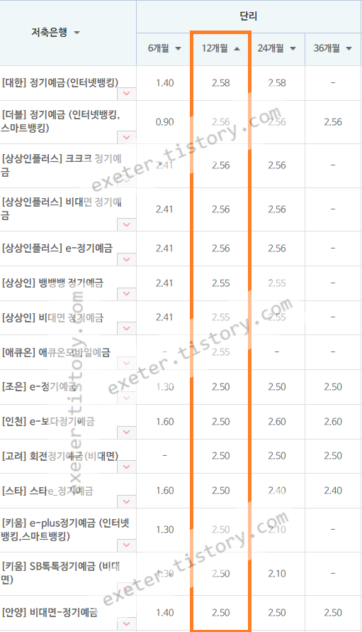 1. [대한] 정기예금(인터넷뱅킹) / 2.58 %