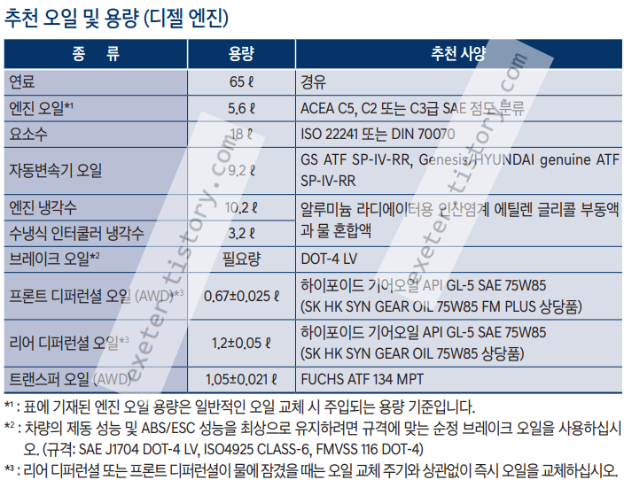 - 변속기 오일: 9.2 리터 (GS ATF SP-IV-RR, Genesis/HYUNDAI genuine ATF SP-IV-RR)