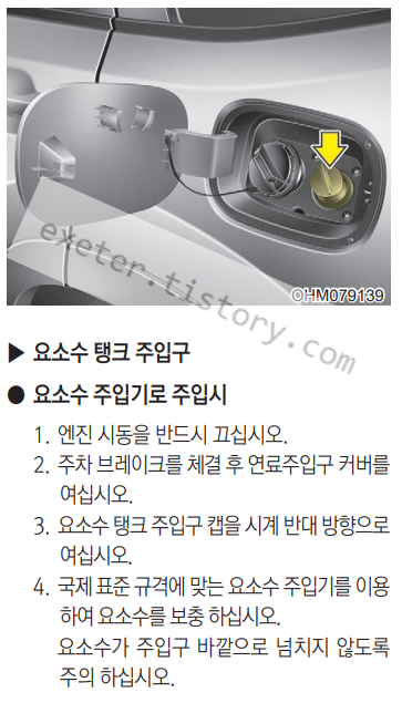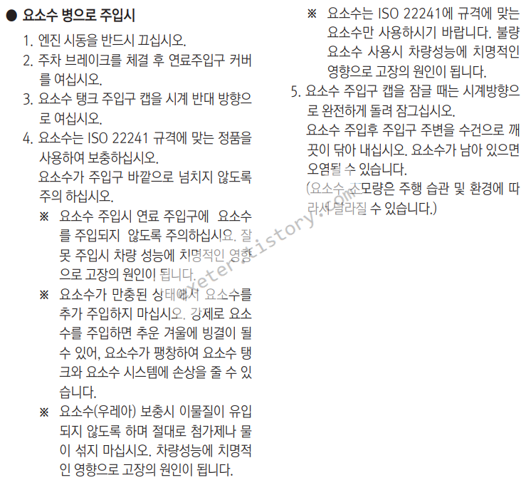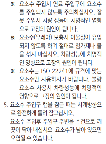 • 요소수 시스템 장착 차량은 규정된 요 소수 만을 주입하여 사용하십시오.
