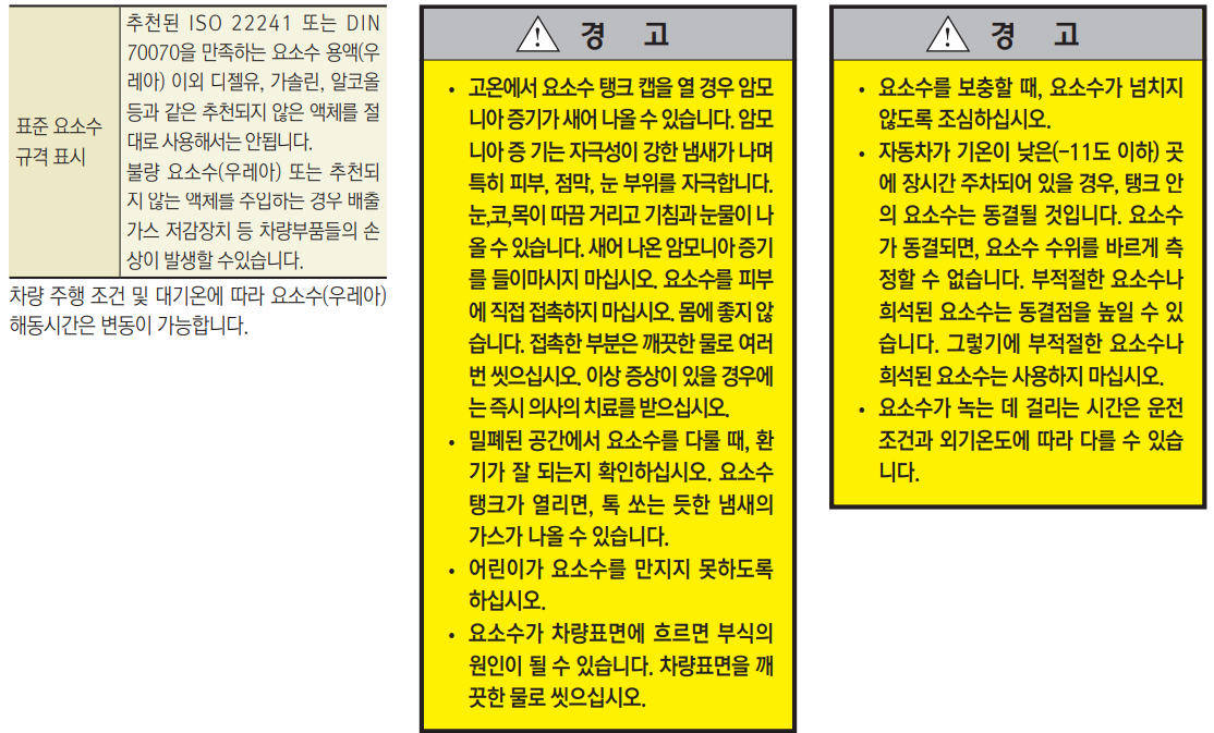 • 자동차가 기온이 낮은(-11도 이하) 곳 에 장시간 주차되어 있을 경우, 탱크 안 의 요소수는 동결될 것입니다. 요소수 가 동결되면, 요소수 수위를 바르게 측 정할 수 없습니다. 부적절한 요소수나 희석된 요소수는 동결점을 높일 수 있 습니다. 그렇기에 부적절한 요소수나 희석된 요소수는 사용하지 마십시오.