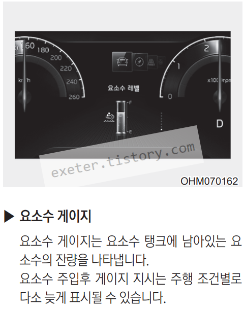 요소수 게이지는 요소수 탱크에 남아있는 요 소수의 잔량을 나타냅니다. 요소수 주입후 게이지 지시는 주행 조건별로 다소 늦게 표시될 수 있습니다.