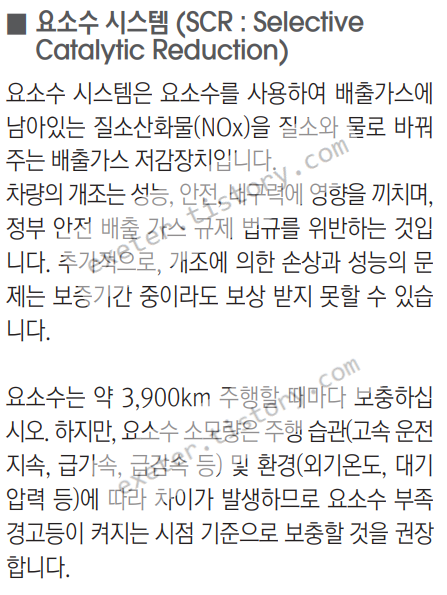 요소수 시스템은 요소수를 사용하여 배출가스에 남아있는 질소산화물(NOx)을 질소와 물로 바꿔 주는 배출가스 저감장치입니다. 차량의 개조는 성능, 안전, 내구력에 영향을 끼치며, 정부 안전 배출 가스 규제 법규를 위반하는 것입 니다. 추가적으로, 개조에 의한 손상과 성능의 문 제는 보증기간 중이라도 보상 받지 못할 수 있습 니다.