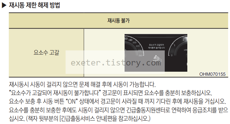 재시동시 시동이 걸리지 않으면 문제 해결 후에 시동이 가능합니다. “요소수가 고갈되어 재시동이 불가합니다” 경고문이 표시되면 요소수를 충분히 보충하십시오. 요소수 보충 후 시동 버튼 “ON” 상태에서 경고문이 사라질 때 까지 기다린 후에 재시동을 거십시오. 요소수를 충분히 보충한 후에도 시동이 걸리지 않으면 긴급출동지원센터로 연락하여 응급조치를 받으 십시오.