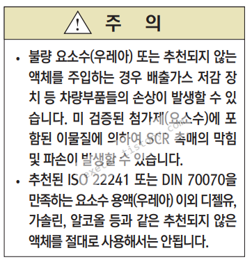 • 불량 요소수(우레아) 또는 추천되지 않 는 액체를 주입하는 경우 배출가스 저 감장치 등 차량부품들의 손상이 발생 할 수 있습니다. 미 검증된 첨가제(요 소수)에 포함된 이물질에 의하여 SCR 촉매의 막힘 및 파손이 발생할 수 있습 니다. 고가의 배출가스 저감장치를 교 환해주어야 하는 상황이 발생할 수 있 습니다