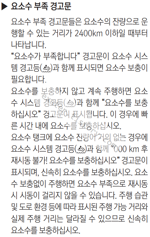 “요소수가 부족합니다”, “요소수를 보충하십 시오” 경고문이 표시되면 요소수를 충분히 보충 하십시오. “000 km 후 재시동 불가! 요소수를 보충하십시오” 경고문이 표시되면 요소수를 충분히 보충하십시오. “요소수가 고갈되어 재시동이 불가합니다” 경고 문과 경고등이 표시되면 시동이 걸리지 않습 니다. 즉시 요소수를 충분히 보충하십시오.