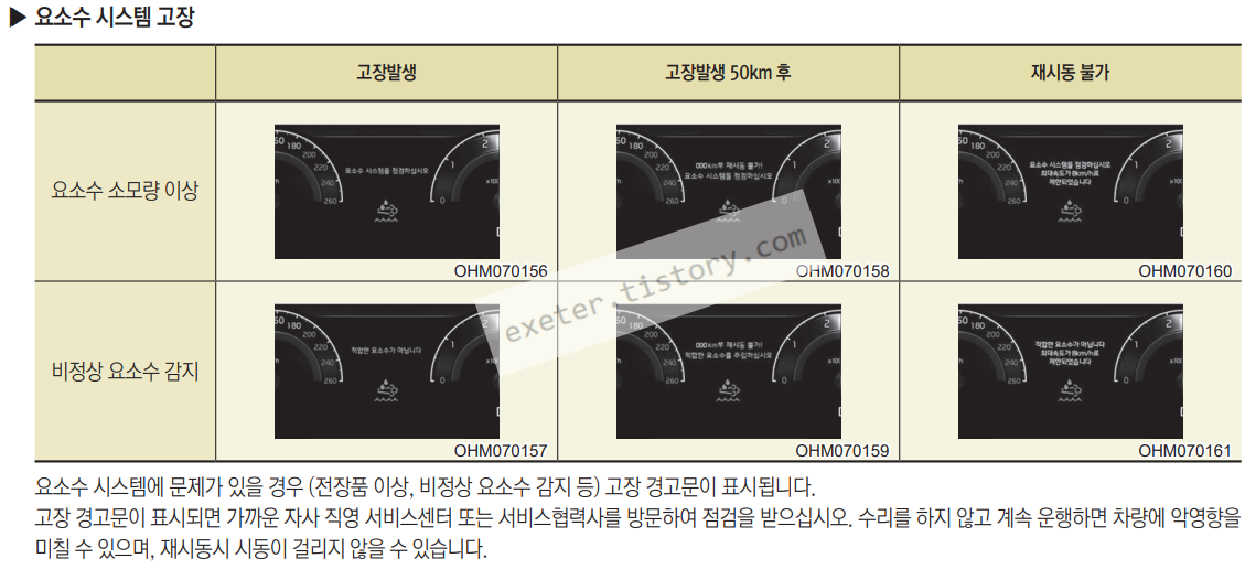| 요소수 소모량 이상 | 요소수 시스템 점검하십시오 | 000 km 후 재시동 불가! 요소수 시스템을 점검하십시오. |