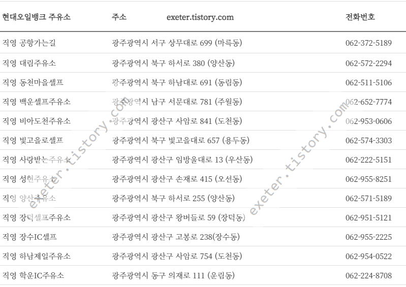 | 현대오일뱅크 주유소 | 주소 exeter.tistory.com | 전화번호 |