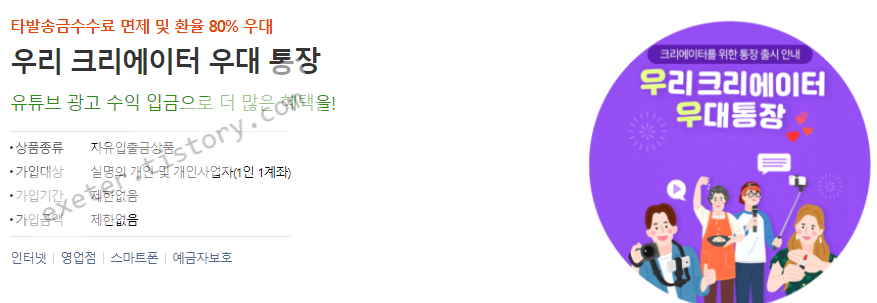 최근에 출시된 것으로 보이는 우리은행 '우리 크리에이터 우대 통장'의 경우 좋은 대안이 될 것 같습니다.