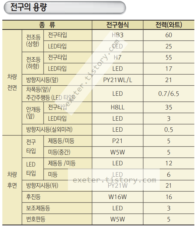 자주 고장나거나 필수적으로 점검이 필요한 전면 전조등/브레이크등(제동등)/번호판 전구 정보는 아래 텍스트로도 표시했습니다. 실내등을 포함하여 전체 정보는 아래 사진을 참고하세요.