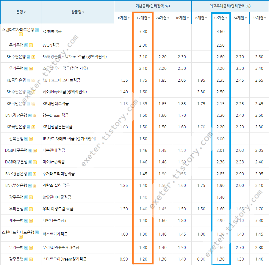 아래는 시중은행 적금 상품의 정기적금 금리를 정액적립식/단리/12개월 기준, 높은 순서로 정렬한 자료입니다.