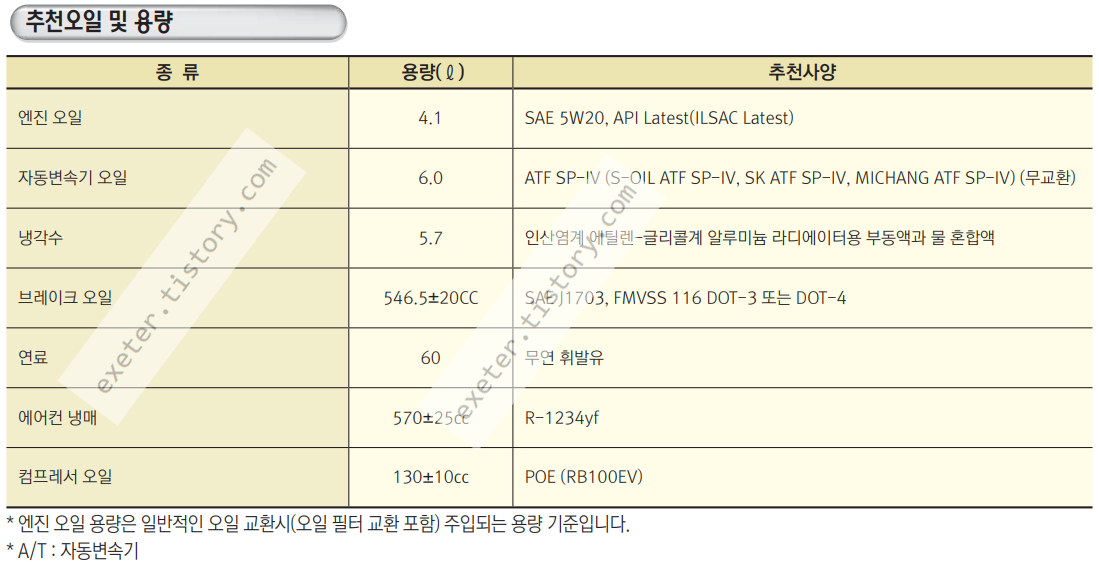 - 엔진 오일 : 4.1 리터 (SAE 5W20, API Latest(ILSAC Latest))
