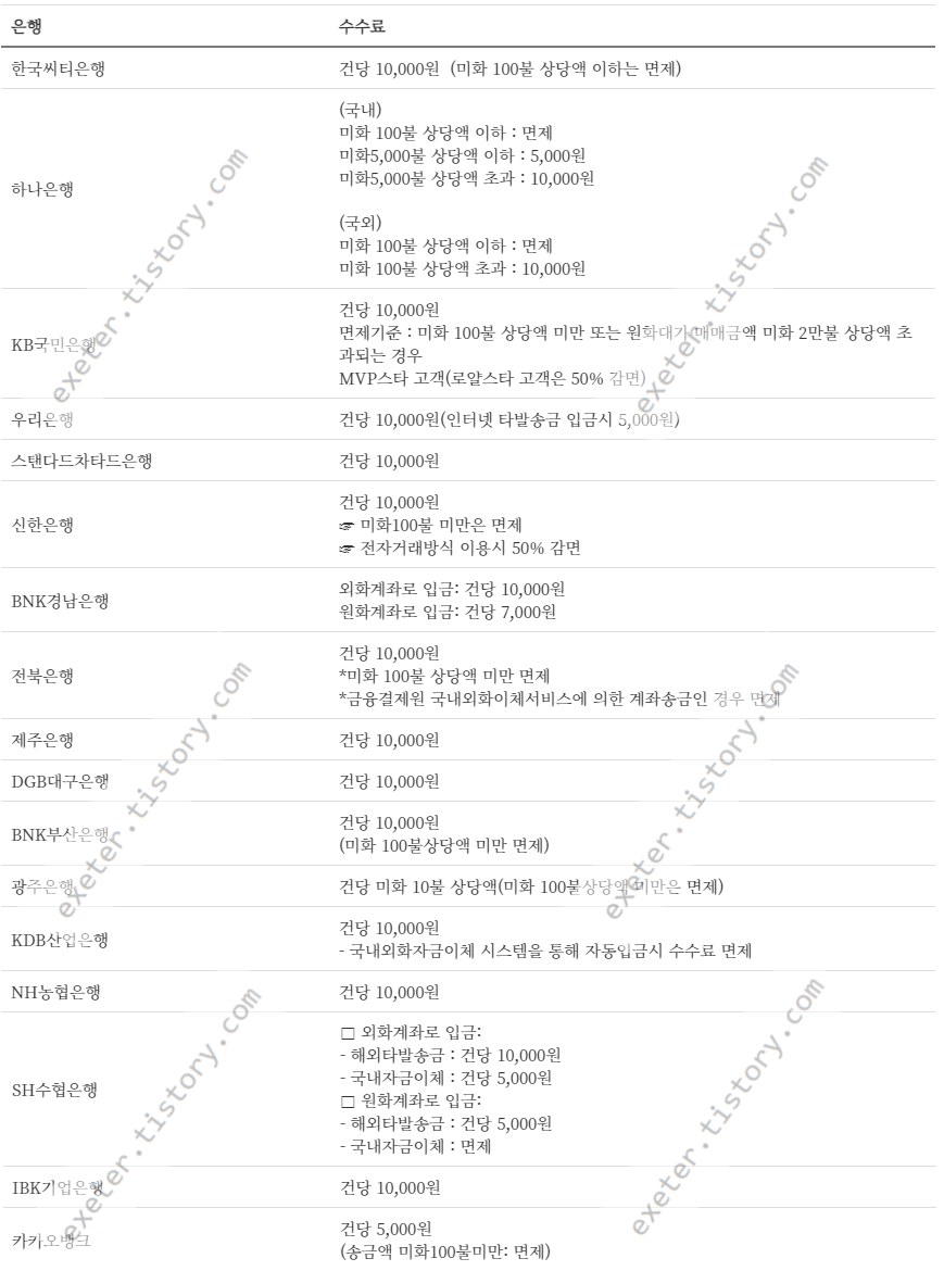 | 한국씨티은행 | 건당 10,000원 (미화 100불 상당액 이하는 면제) |