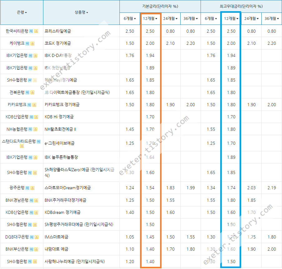 은행 / 상품명 / 기본금리 (단리 이자(%), 12개월 기준)