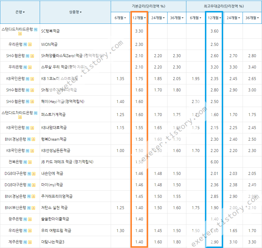 아래는 시중은행 정기 적금 상품 금리를 정액적립식/단리/12개월 기준, 높은 순서로 정렬한 자료입니다.