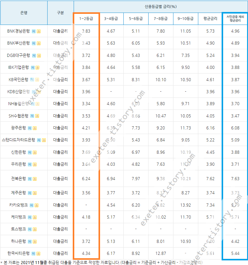 2021년 11월 기준 신용한도대출 - 마이너스 통장 (마통) 금리 비교는 아래 링크에서 참조하세요.
