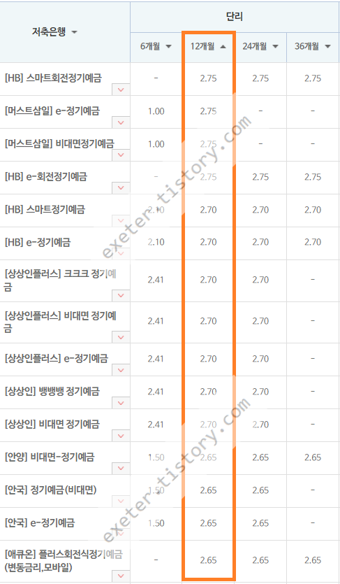 은행 상품명 / 기본금리 (단리 이자(%), 12개월, 높은 이자순서)