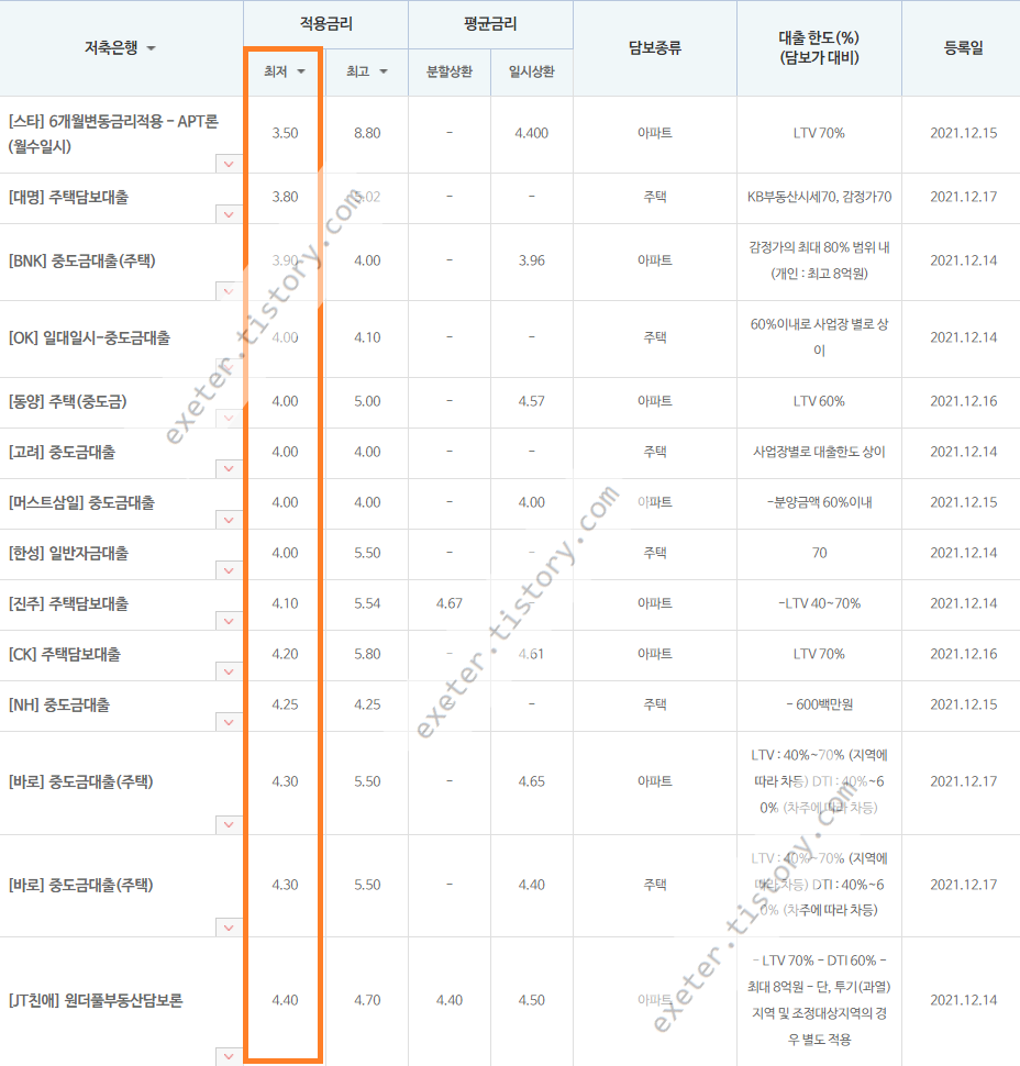 저축 은행 주택담보대출 아파트/주택 (최저금리 기준) 금리가 낮은 순서는 아래와 같습니다.