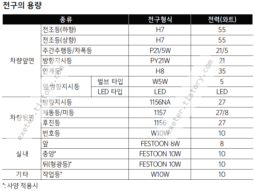 자주 고장나거나 필수적으로 점검이 필요한 전면 전조등/브레이크등(제동등)/번호판 전구 정보는 아래 텍스트로도 표시했습니다. 실내등을 포함하여 전체 정보는 아래 사진을 참고하세요.