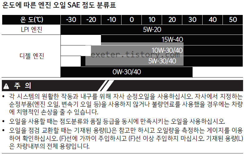 LPI엔진: 5W-20디젤엔진: 15W-40, 10W-30/40, 5W-30/40, 0W-30/40