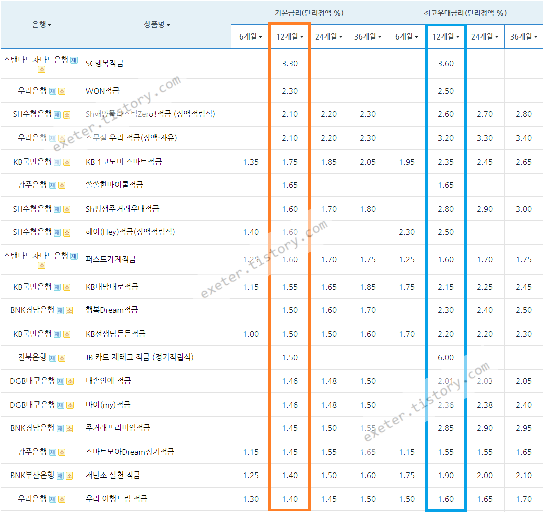 아래는 시중은행 정기 적금 상품 금리를 정액적립식/단리/12개월 기준, 높은 순서로 정렬한 자료입니다.