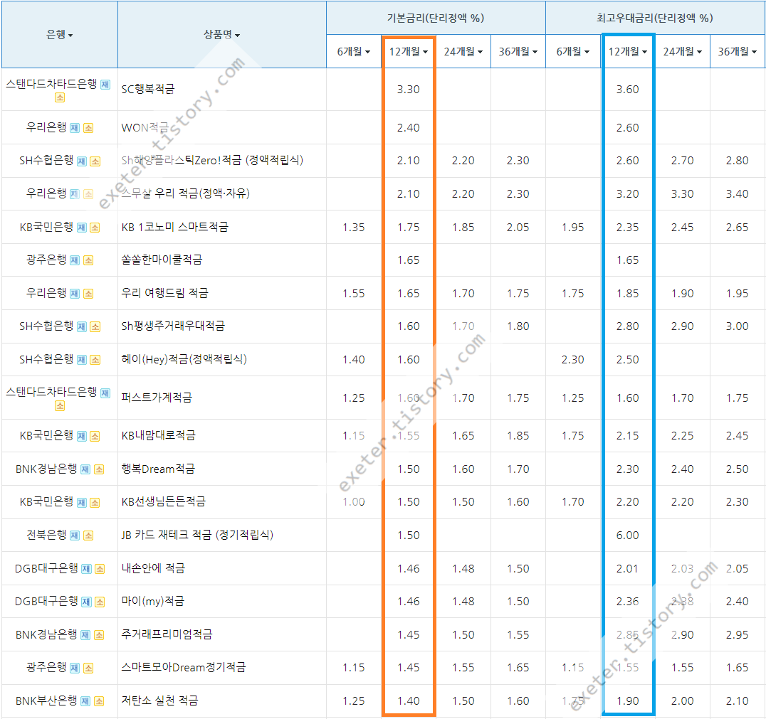 아래는 시중은행 정기 적금 상품 금리를 정액적립식/단리/12개월 기준, 높은 순서로 정렬한 자료입니다.
