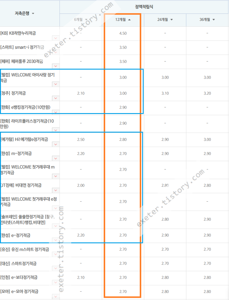 아래 목록에서는 일부 특별한 조건으로 가입해야 고금리를 제시하는 저축은행 상품은 작성자 판단으로 임의 제거했습니다. 따라서 아래에 제시한 상품의 대부분은 비대면/인터넷 가입이 가능한 상품으로, 특별한 부가 조건 없이 제공되는 금리입니다.