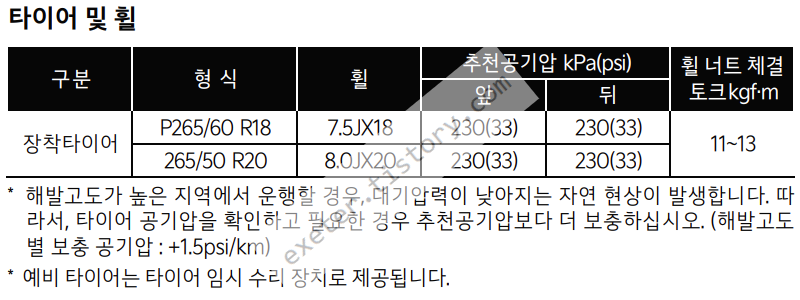 타이어 형식/공기압: 265/50 R20 / 33 psi