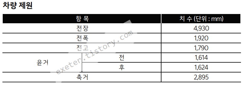 차량 치수 제원 (단위: 밀리미터)