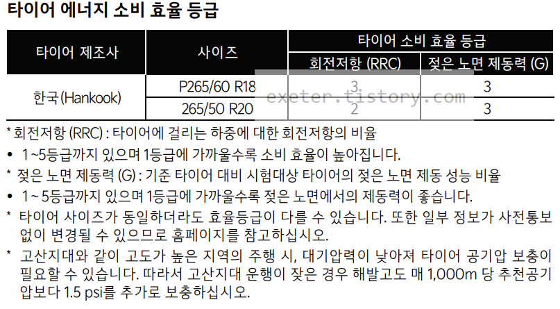 상세 타이어 규격 및 효율 등급/노면 제동력은 아래 사진을 참고하세요.
