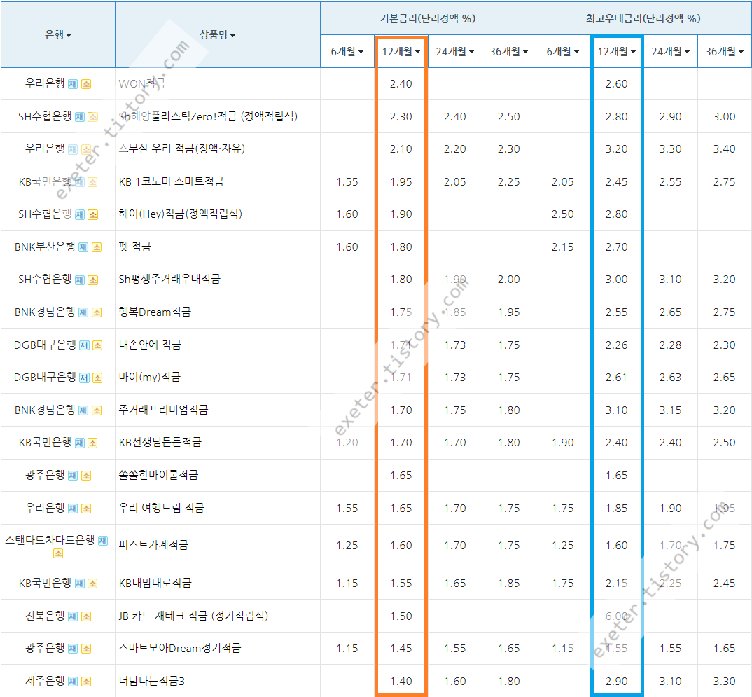 아래는 시중은행 정기 적금 상품 금리를 정액적립식/단리/12개월 기준, 높은 순서로 정렬한 자료입니다.