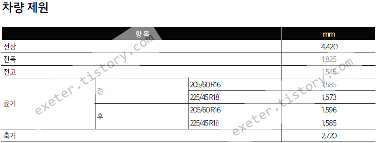 차량 치수 제원 (단위: 밀리미터)