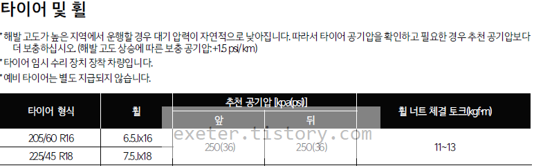 * 해발고도가 높은 지역에서 운행할 경우, 대기압력이 낮아지는 자연 현상이 발생합니다. 따라서, 타이어 공기압을 확인하고 필요한 경우 추천공기압보다 더 보충하십시오. (해발고도 별 보충 공기압 : +1.5psi/km)