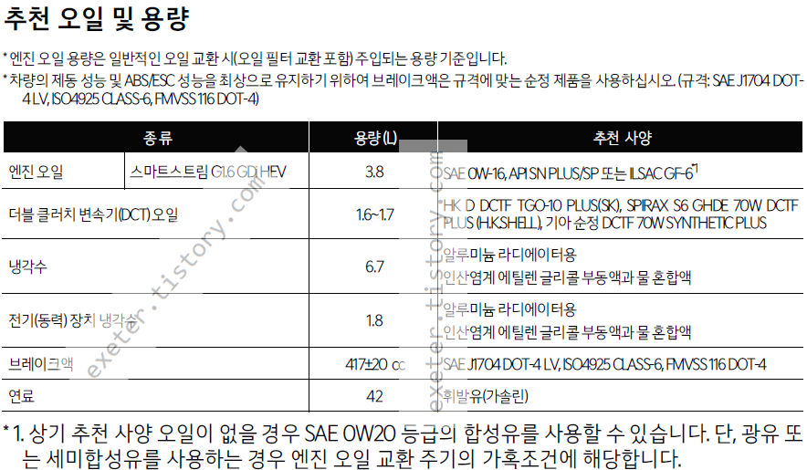 엔진오일(스마트스트림 G1.6 GDi HEV): 3.8 리터