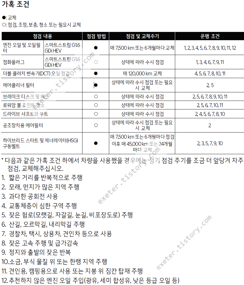 이러한 가혹 조건인 경우에는 G1.6 GDi HEV 엔진 오일은 '매 7,500Km 또는 6개월' 마다 교체로 안내하고 있습니다. 가혹 조건인 경우 상대적으로 점검 및 교체 주기가 더 짧습니다.