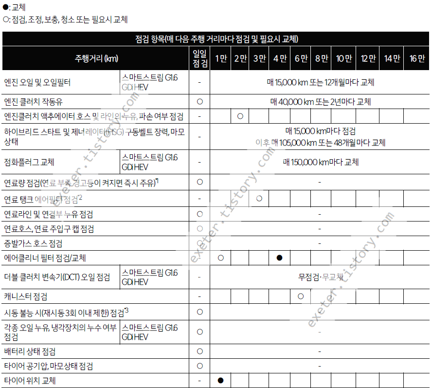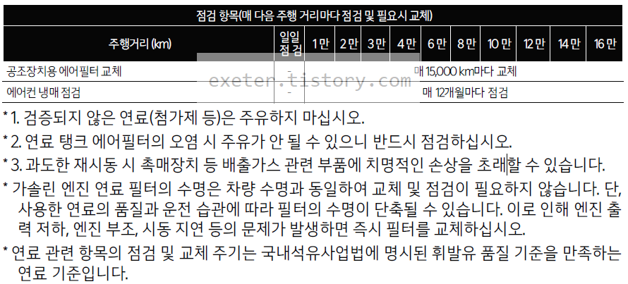 * 연료 관련 항목의 점검 교체 주기는 국내석유사업법에 명시된 휘발유 품질 기준을 만족하는 연료 기준입니다.