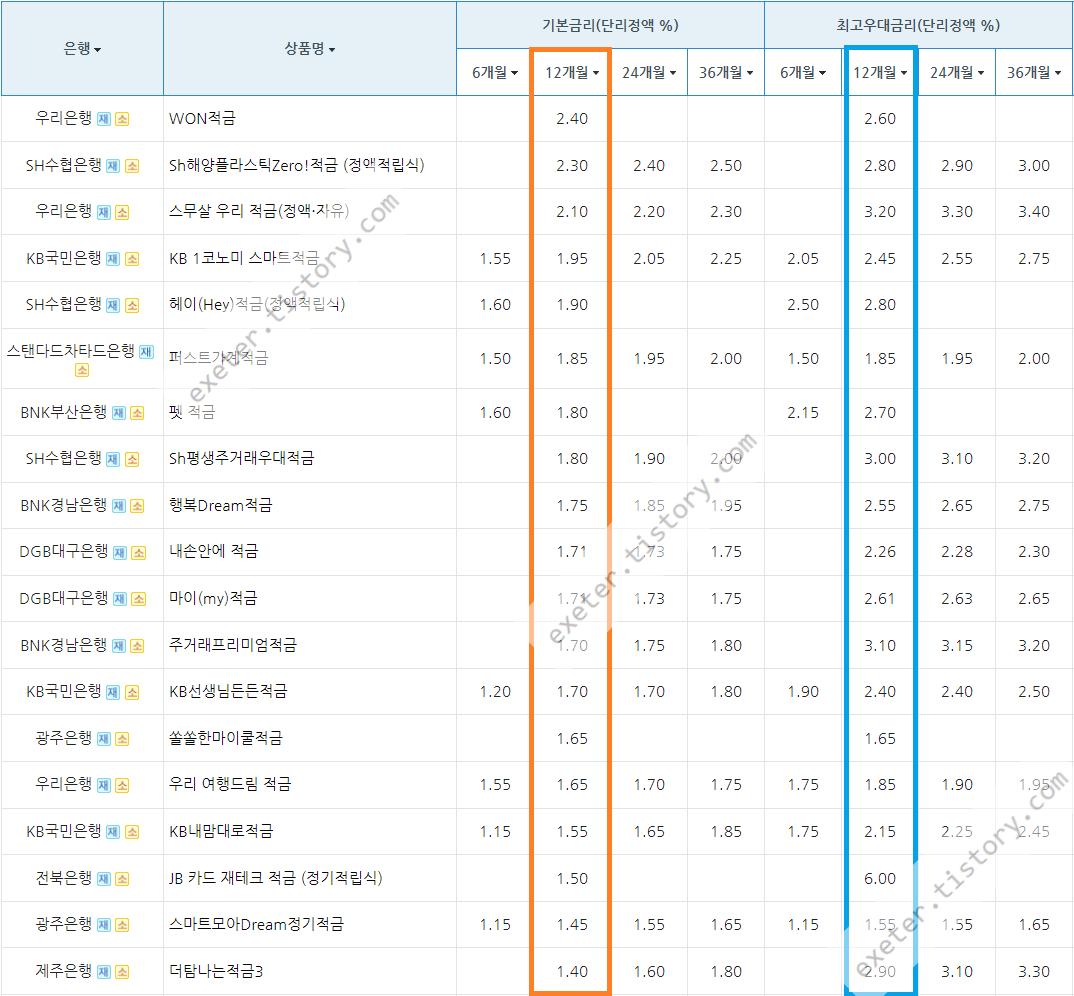 아래는 시중은행 정기 적금 상품 금리를 정액적립식/단리/12개월 기준, 높은 순서로 정렬한 자료입니다.