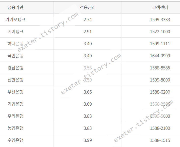 아래 금융기관 순서는 적용금리가 낮은 순서입니다.