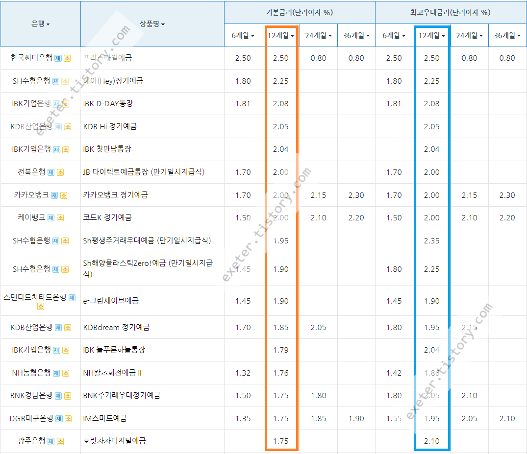 은행 / 상품명 / 기본금리 (단리 이자(%), 12개월 기준)
