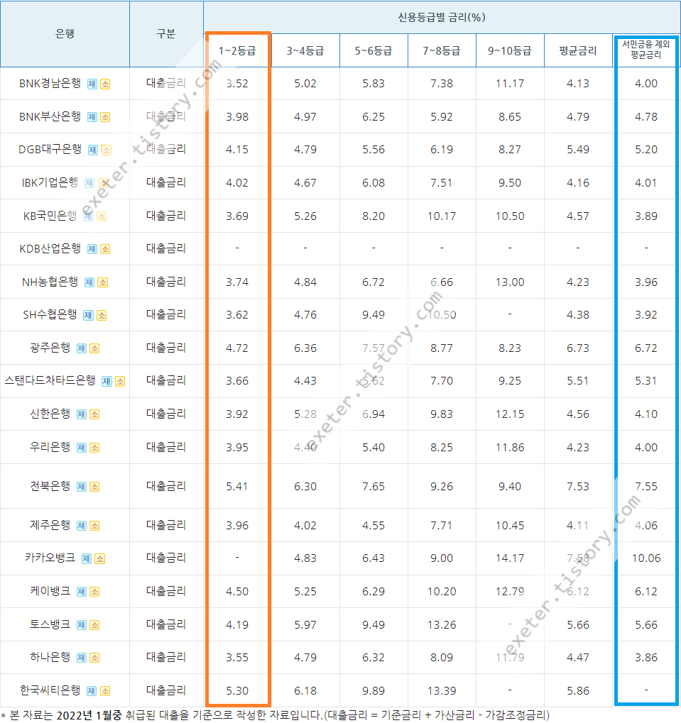 기준: 2022년 1월 취급된 신용대출 / 신용등급 1-2등급 기준