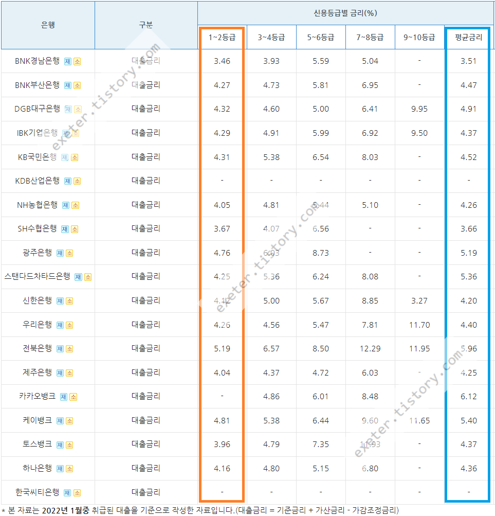 기준: 2022년 1월 중 취급된 신용대출(마이너스 통장) / 신용등급 1-2등급 기준