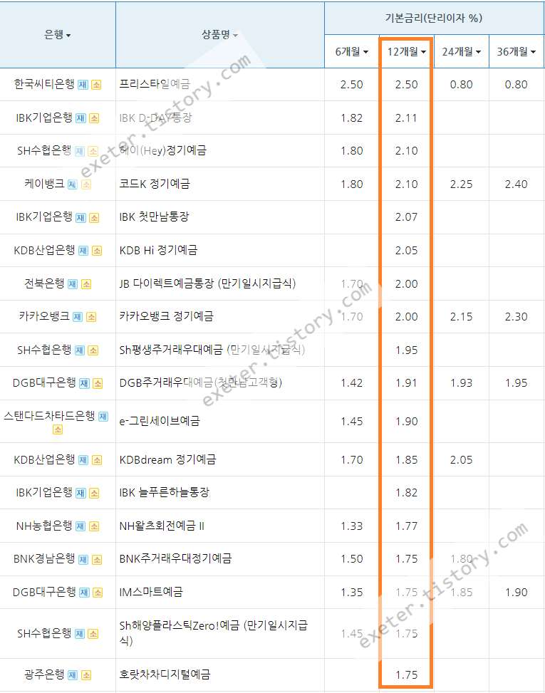 은행 / 상품명 / 기본금리 (단리 이자(%), 12개월 기준)