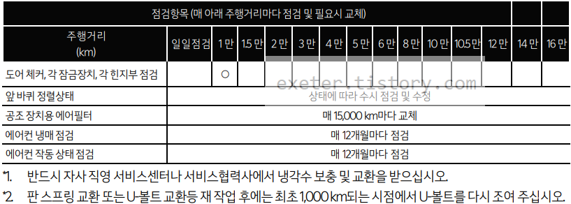 다음의 통상조건 점검주기는 주행거리에 따른 주기를 기본으로 하였으나, 일부 부품은 주행거리 와 함께 시간경과에 따라서도 점검 또는 교체해야 하는 경우도 있습니다. 거리/시간 병기 항목은 차량의 주행거리와 경과시간 중 먼저 도래하는 시점에 해당 부품의 점검 이나 교체를 해야 하므로 주의하십시오.